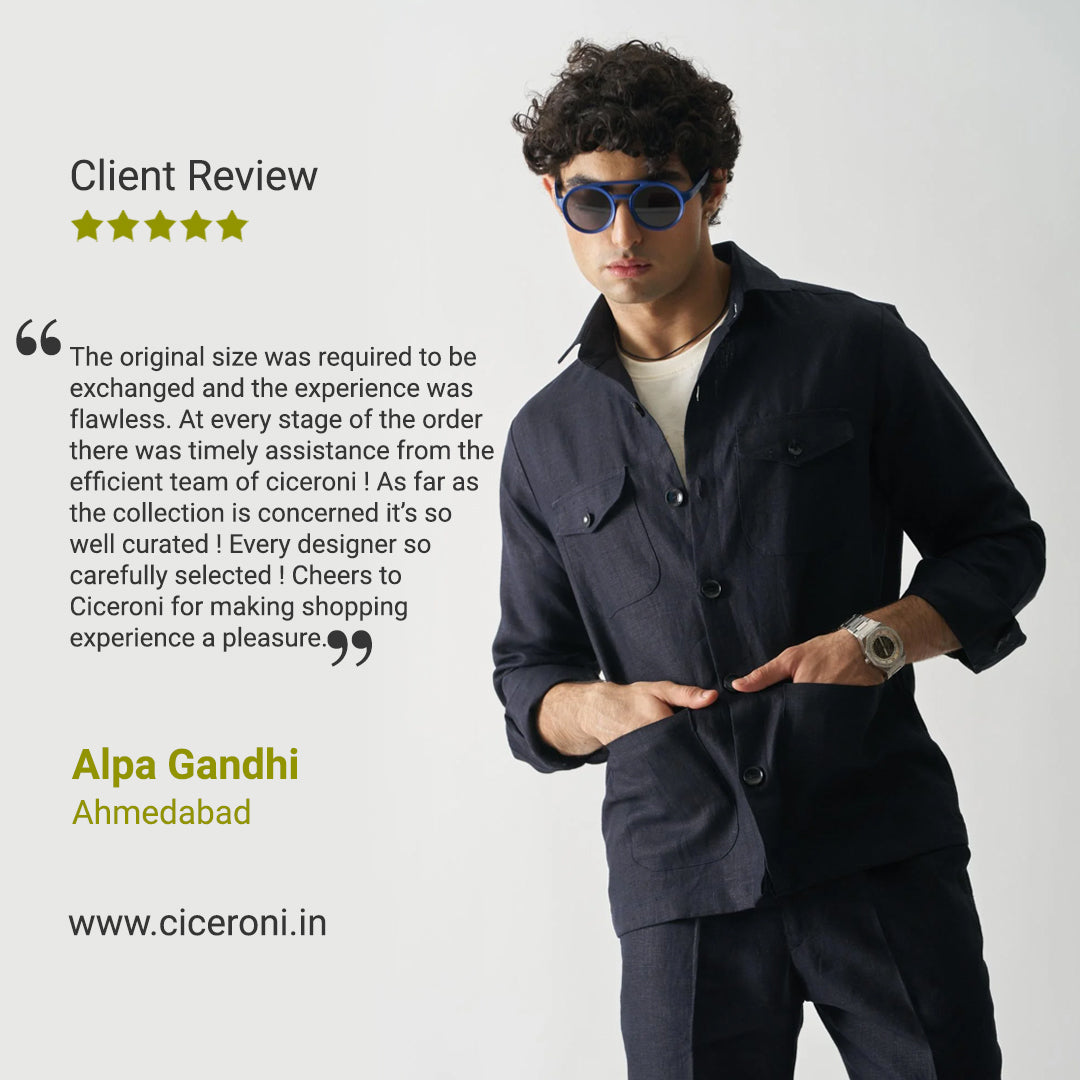 Shop hassle-free on Ciceroni and save time. In case of any issues, you can get in touch with our customer care number or write to us on hello@ciceroni.in for size customizations, delivery timelines and or urgent deliveries, material specifications or just styling and shopping guidance. We ship globally across the world. In case you do not see your country at the check-out, write to us and we will help you further. We are just a call and message away for your pleasurable shopping experience.